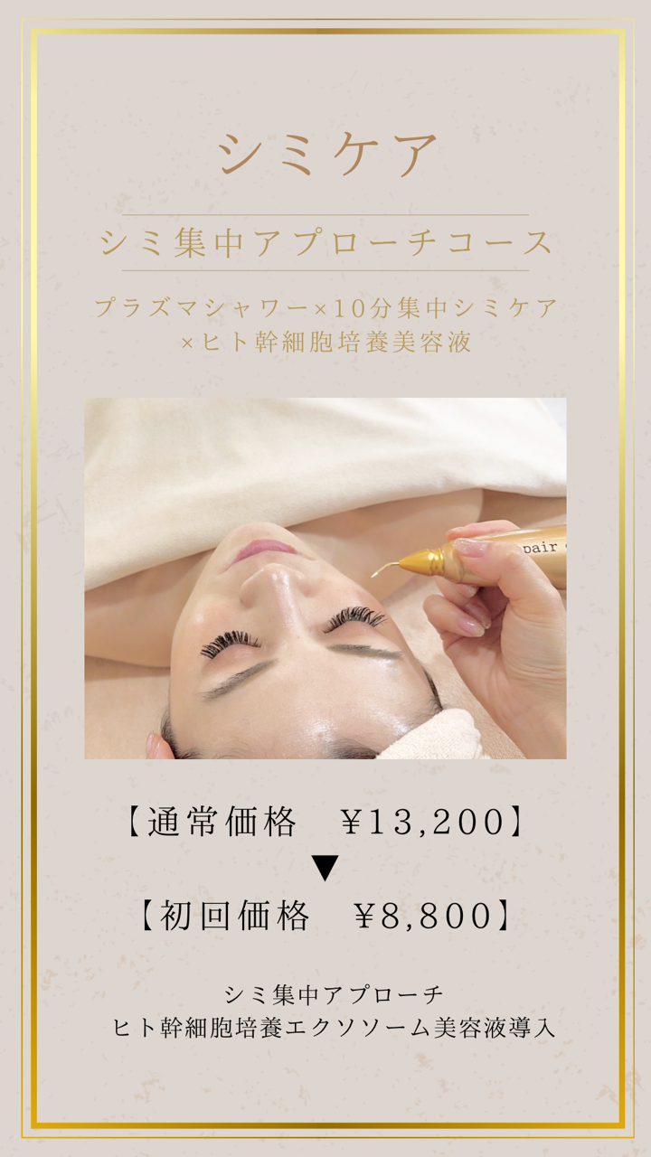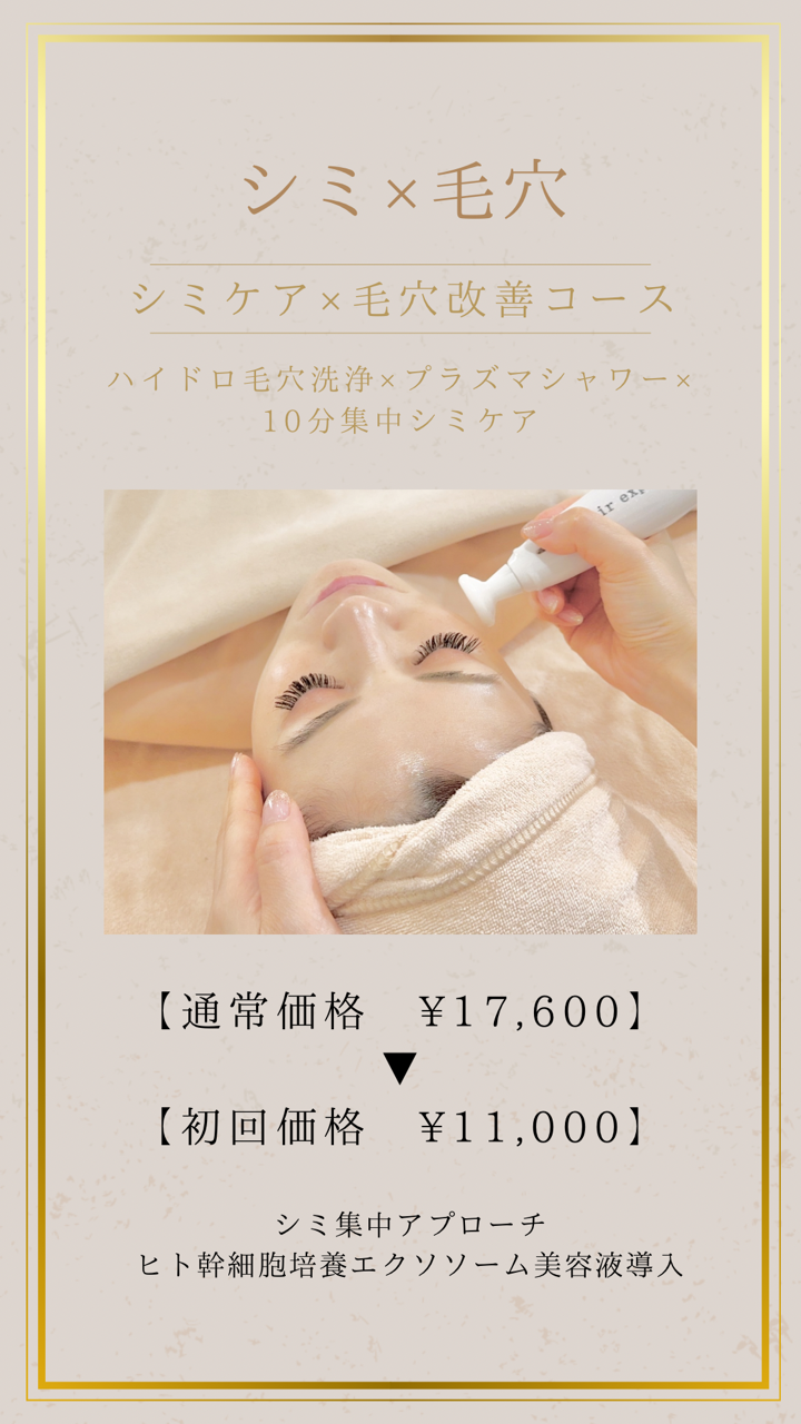【シミケア×毛穴改善コース】 ハイドロ毛穴洗浄×プラズマシャワー×10分集中シミケア× ヒト幹細胞培養美容液 イオン導入の170倍の浸透力 ヒト幹細胞培養美容液導入 (クレンジング・超音波洗浄・ハイドロ毛穴洗浄・プラズマシャワー・10分集中シミケア×ヒト幹細胞培養美容液・整肌) 初回価格…………………………………………………¥11,000 |